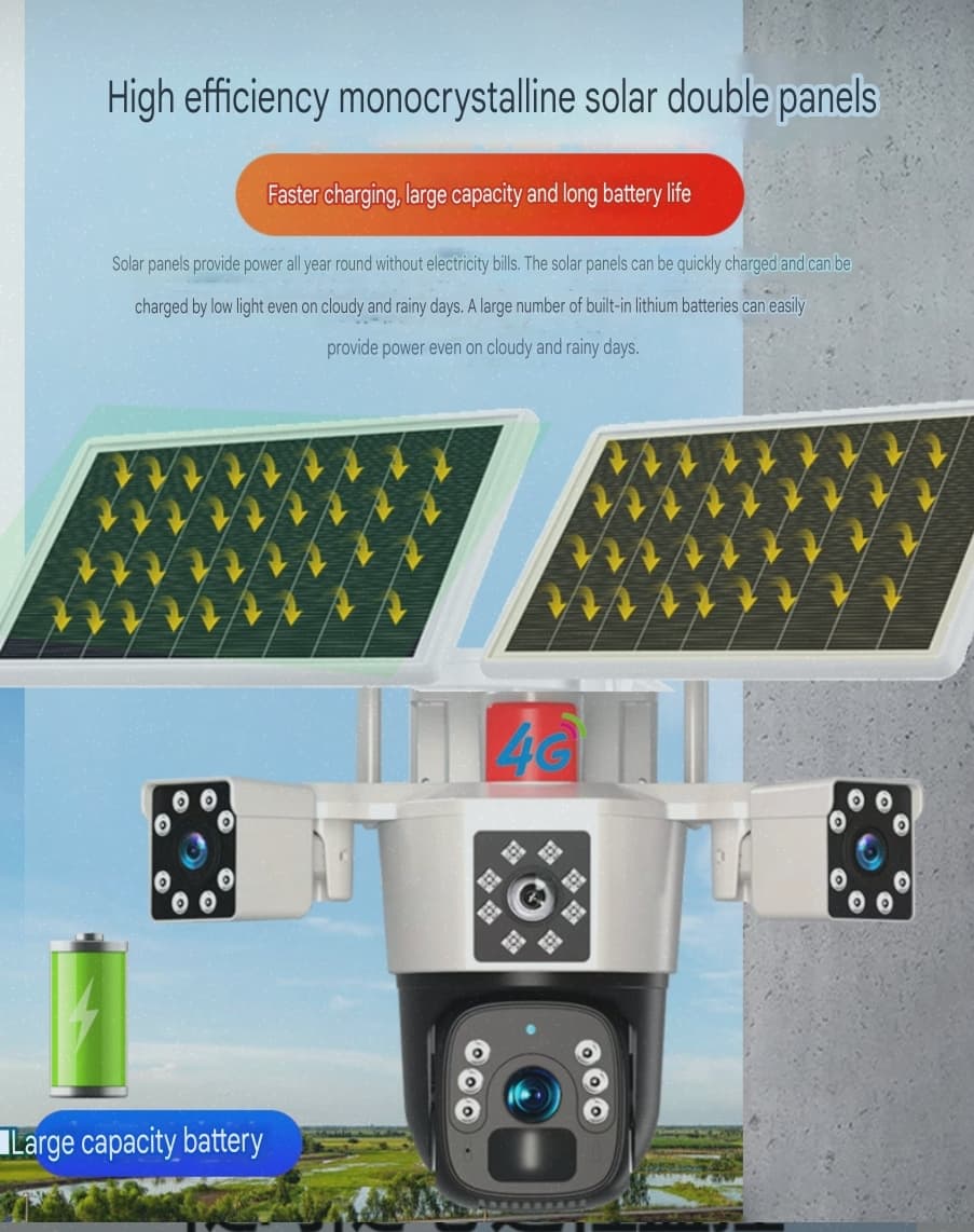 Upgrade your security with our 4G 4-in-1 CCTV Camera, designed for reliable surveillance without Wi-Fi. This high-tech camera features multiple lenses for wide-area coverage, crystal-clear video quality, and night vision for 24/7 protection. With 4G connectivity, you can monitor your property remotely from your smartphone, ensuring real-time access anytime, anywhere. Its motion detection, two-way audio, and weatherproof design make it perfect for homes, offices, farms, and outdoor spaces. Stay secure with cutting-edge technology and uninterrupted surveillance!