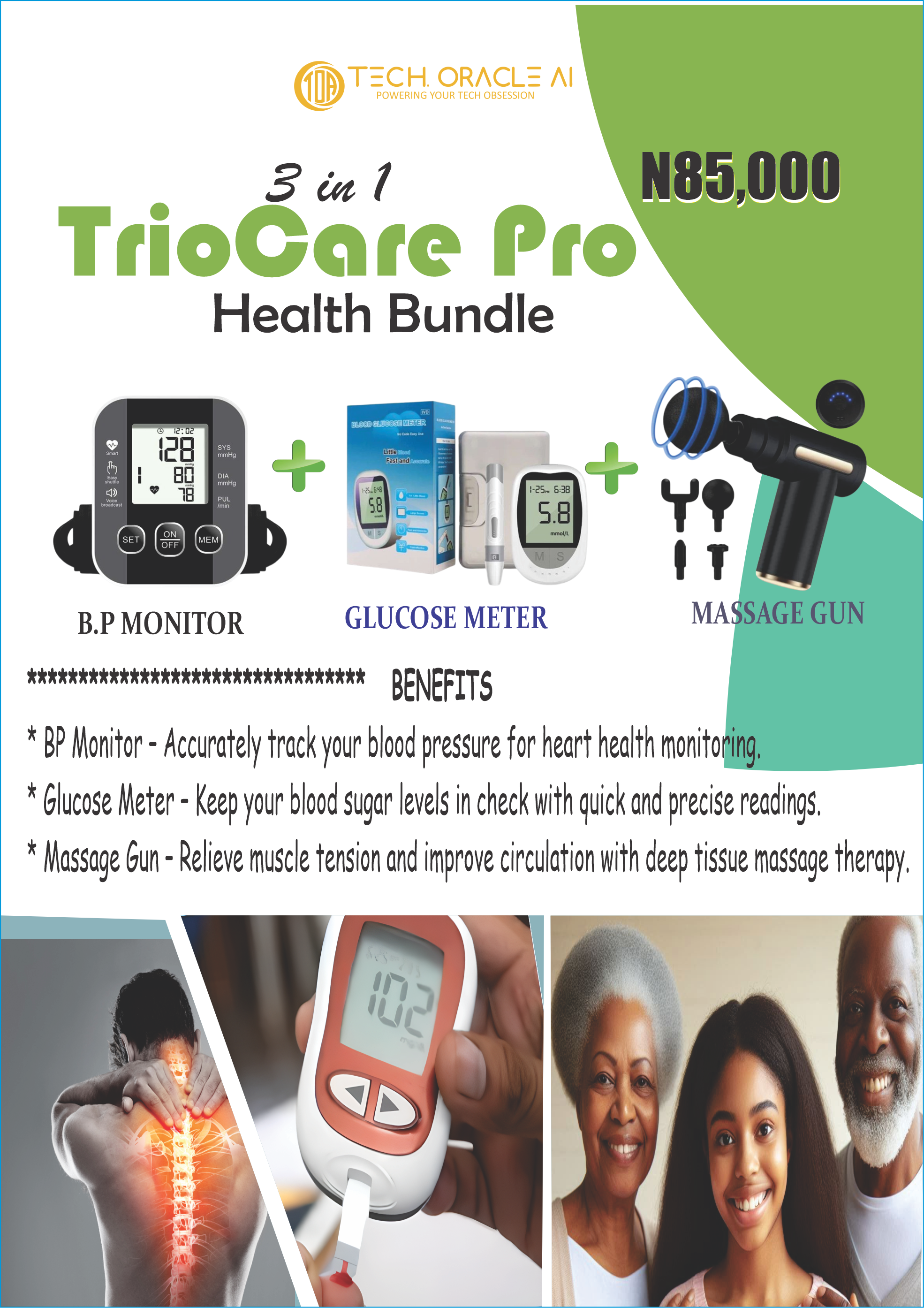 Perfect for home use, this essential health bundle helps you stay proactive about your well-being. Stay informed, stay relaxed, and live healthier with Triocare Pro!