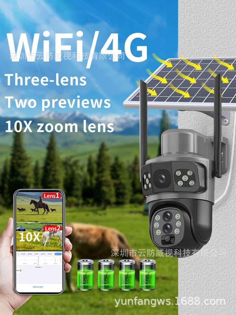 Shipping Available NationwideEnhance your security with our Solar 4G CCTV Camera, featuring three powerful lenses, including a 10X zoom lens for detailed surveillance and dual preview for wide-area coverage. This advanced camera operates on solar power, ensuring uninterrupted performance with a long-lasting battery for 24/7 monitoring. With 4G connectivity, you can access real-time footage remotely on your smartphone, even in areas without Wi-Fi. Built for durability, it is weatherproof and night-vision enabled, making it the perfect security solution for homes, offices, farms, and remote locations. Stay protected, anytime, anywhere!